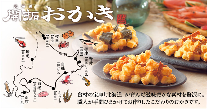 食材の宝庫「北海道」が育んだ滋味豊かな素材を贅沢に。職人が7日間もの時間と手間かけておつくりしたこだわりのおかきです。