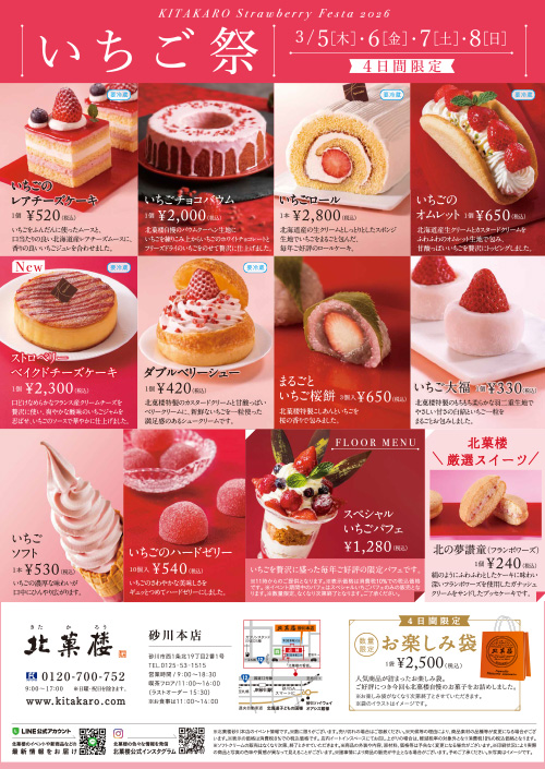 ※終了しました 【北菓楼 砂川本店】 3月6日(木)~3月9日(日)4日間限定で「いちご祭」を開催いたします。